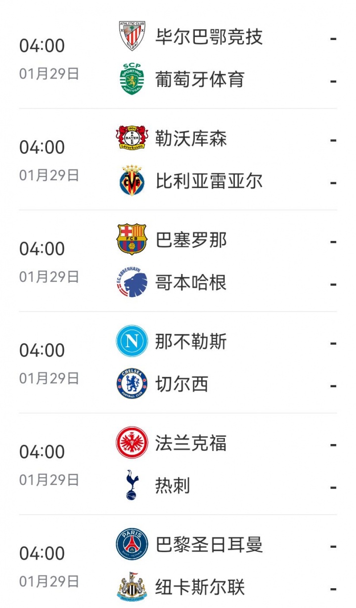 巴萨、葡萄牙体育、曼城、马竞、亚特兰大、国米、尤文、多特、加拉塔萨雷、卡拉巴赫、马赛、勒沃库森、摩纳哥、埃因霍温、毕尔巴鄂竞技、奥林匹亚科斯